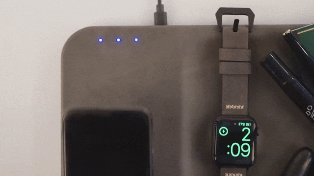 Appleの全てのデバイスを充電しようとすると安全で高い出力が必要だが、GAZE TRAYは最大48Wの出力が可能。iPhoneの充電部分は最大10Wの充電システムを搭載。またAppleWatchとAirpodsの充電部分は純正充電器と同一の最大3W対応のワイヤレス充電器を搭載している。