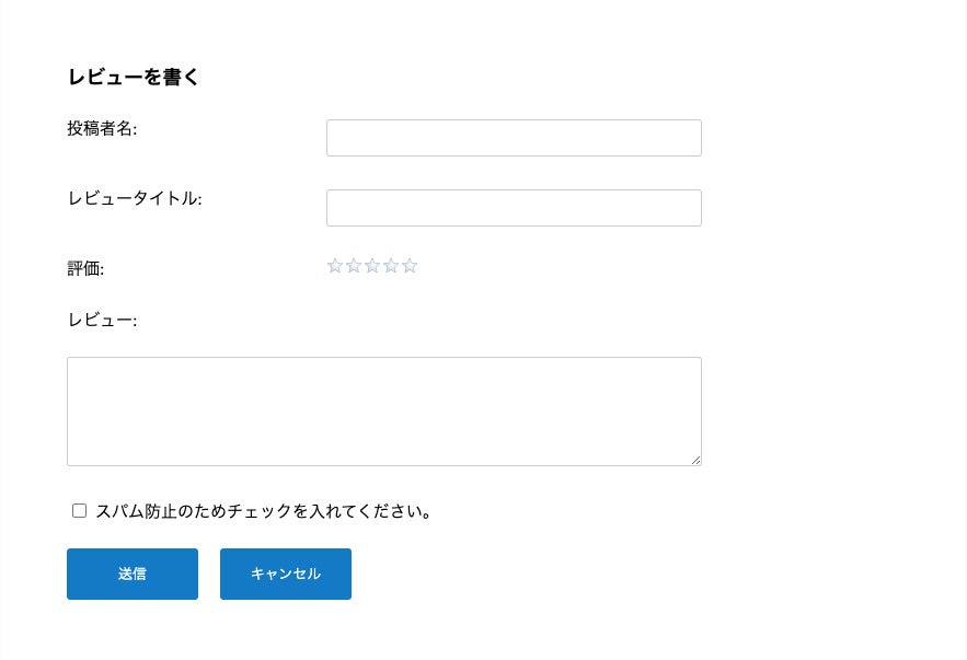 「投稿者名、レビュータイトル、評価、レビュー内容」を投稿する事ができます。