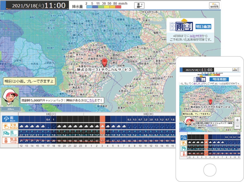雨によるキャンセル=機会損失はゴルフ場の宿命だ。テレビ等の一般的な気象情報では、おおまかな範囲での配信が多く、「◯◯県、明日は雨」と予報が出ると県全域が雨になると思い込まれる傾向があり、実際には曇りや小雨で十分プレイ可能な日でも、テレビで雨と予報された翌日のキャンセルは一気に増えるという。ゴルフ場によっては、雨による予約者のキャンセルは月500名を超える場合もあるが、イーグルアイズ雨割保険に加入していれば雨と予測された日はプレー代金の一部もしくは全額が返金されるため、プレイヤーにとってはキャンセルを思いとどまる動機となる可能性が高いのはうなずける。
