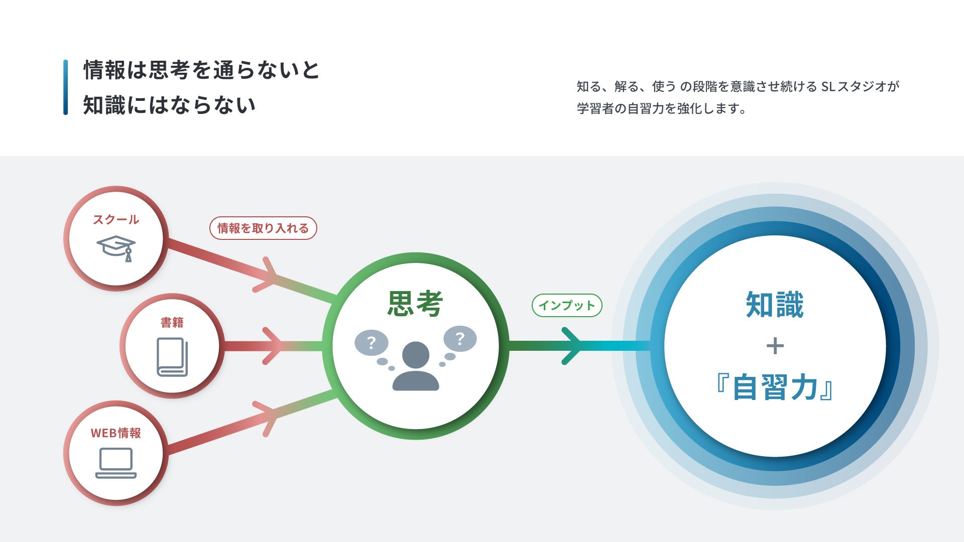 学習の成否は書籍やスクールなど学習方法を選ぶかではなく、どれだけ情報を思考によって知識としてインプット出来たか、即ち「⾃習力」が備わったかにかかっていると考えています。
