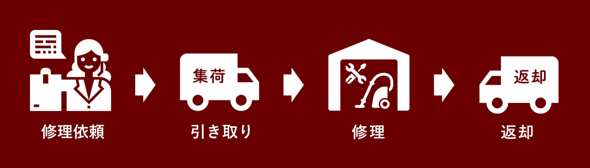 集荷から、診断、お見積り(無料)、部品交換(修理)、検品、クリーニング、最上位機種の貸出機用意まで。修理に出す煩わしさや修理期間中のご不便も軽減します。