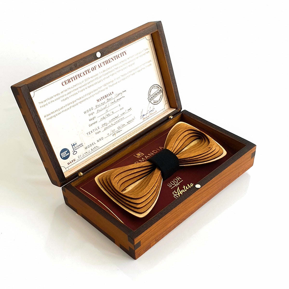 蝶ネクタイはすべて、ほのかな木の香りたつ特製木製ボックス(フィンランドの白樺の木を使用)の中に商品情報とシリアルナンバーを記載した証明書をお入れしてお届けいたします。