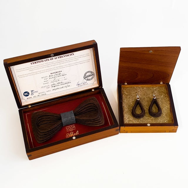 Hermandiaのアトリエで一つ一つ手作りしたメイド・イン・フィンランドの木製蝶ネクタイまたは蝶ネクタイとペア・ピアスのセットを、送料無料でお届けいたします。