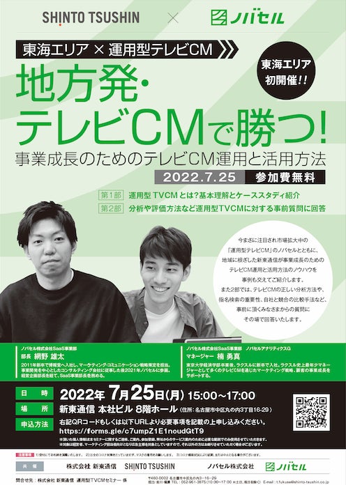株式会社新東通信(代表取締役会長兼社長:谷 喜久郎、以下新東通信)は、ノバセル株式会社(代表取締役社長:田部 正樹、以下ノバセル)と共催で「運用型テレビCM」セミナーを7/25(月)に開催します。