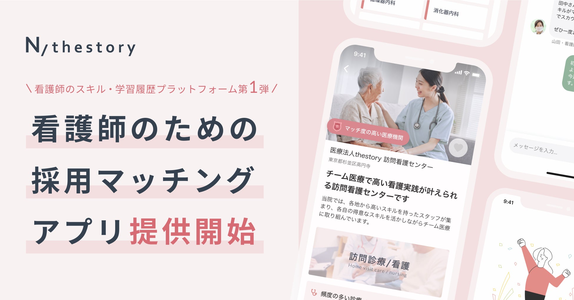株式会社thestory(ジストリー)(本社:福岡県糸島市、代表:河京子 / 山本遼太郎)は、看護師が自分らしくキャリアを描くことができる社会を目指し、看護師のスキル・学習履歴の見える化プラットフォーム「/thestory(ジストリー)」の開発を進めております。その第一弾サービスとして、看護師の採用マッチングアプリ「N/thestory(ジストリー)」正式版(iOS,Android)を本日リリースしたことをお知らせいたします。本アプリでは、看護師の保有スキルやこれから学びたいスキルを通じた医療機関とのマッチングが可能となり、看護師の皆さまは登録から求人エントリーなどの利用まで全て無料でご利用いただけます。さらに、看護師のキャリア観や学ぶ意欲に理解・共感した医療機関から、テンプレートではない個別のスカウトメールが届くダイレクトリクルーティング機能を通じて、双方の医療への想いを実現する転職を支援してまいります。首都圏エリア在宅医療領域で先行リリースしており、現在130以上の事業所様にお申し込みをいただいております。今後はエリアや医療領域を順次拡大していく予定です。