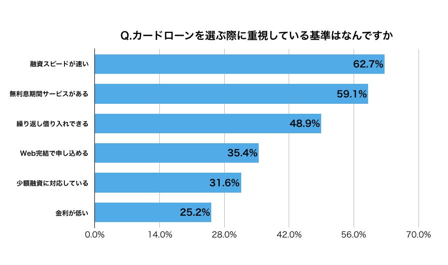 カードローンを選ぶ基準として回答が多かったのは、融資スピードの速さと無利息期間サービスの2点です。