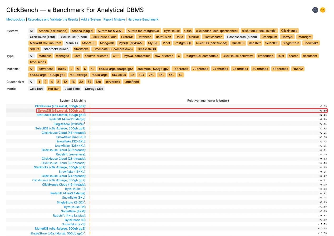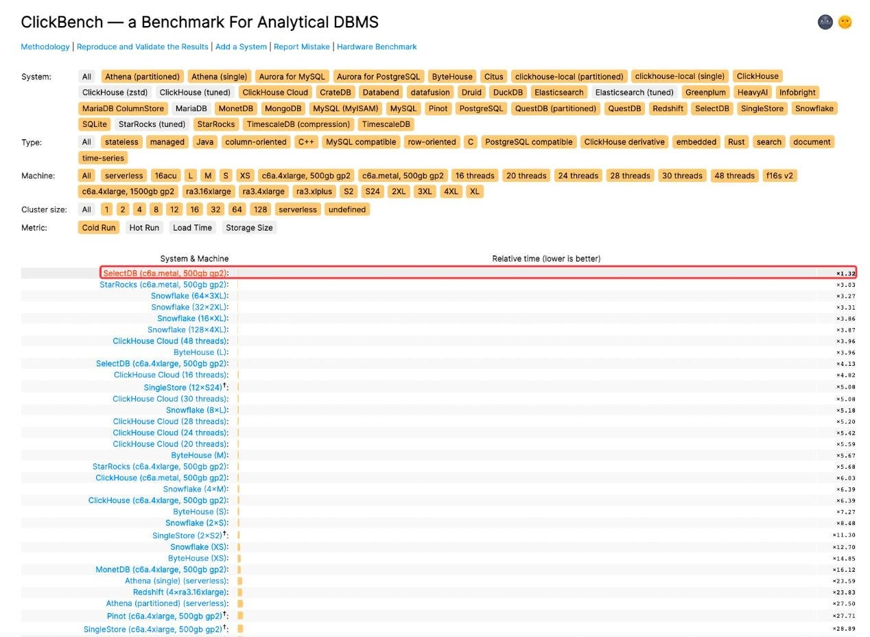 2022年10月8日、北京フライホイールデータテクノロジーの次世代クラウドネイティブのリアルタイムデータウェアハウス SelectDB は、グローバル分析型データベースのパフォーマンスランキング ClickBench の c6a.4xlarge,500gb gp2 モデルで首位にランクインし、多くの指標が上位にランクインした。