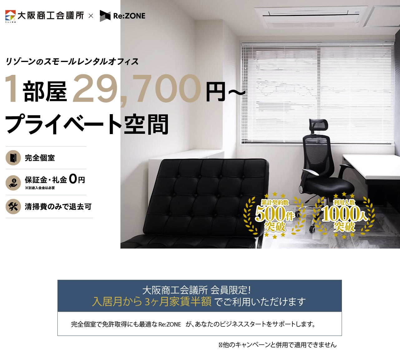 - 【大阪商工会議所× K-FIRST「Re:ZONE」連携 会員限定特別プラン】 「Re:ZONE」のスモールオフィスを大阪商工会議所会員企業限定で 入居月から3ヶ月間半額で提供させていただきます。