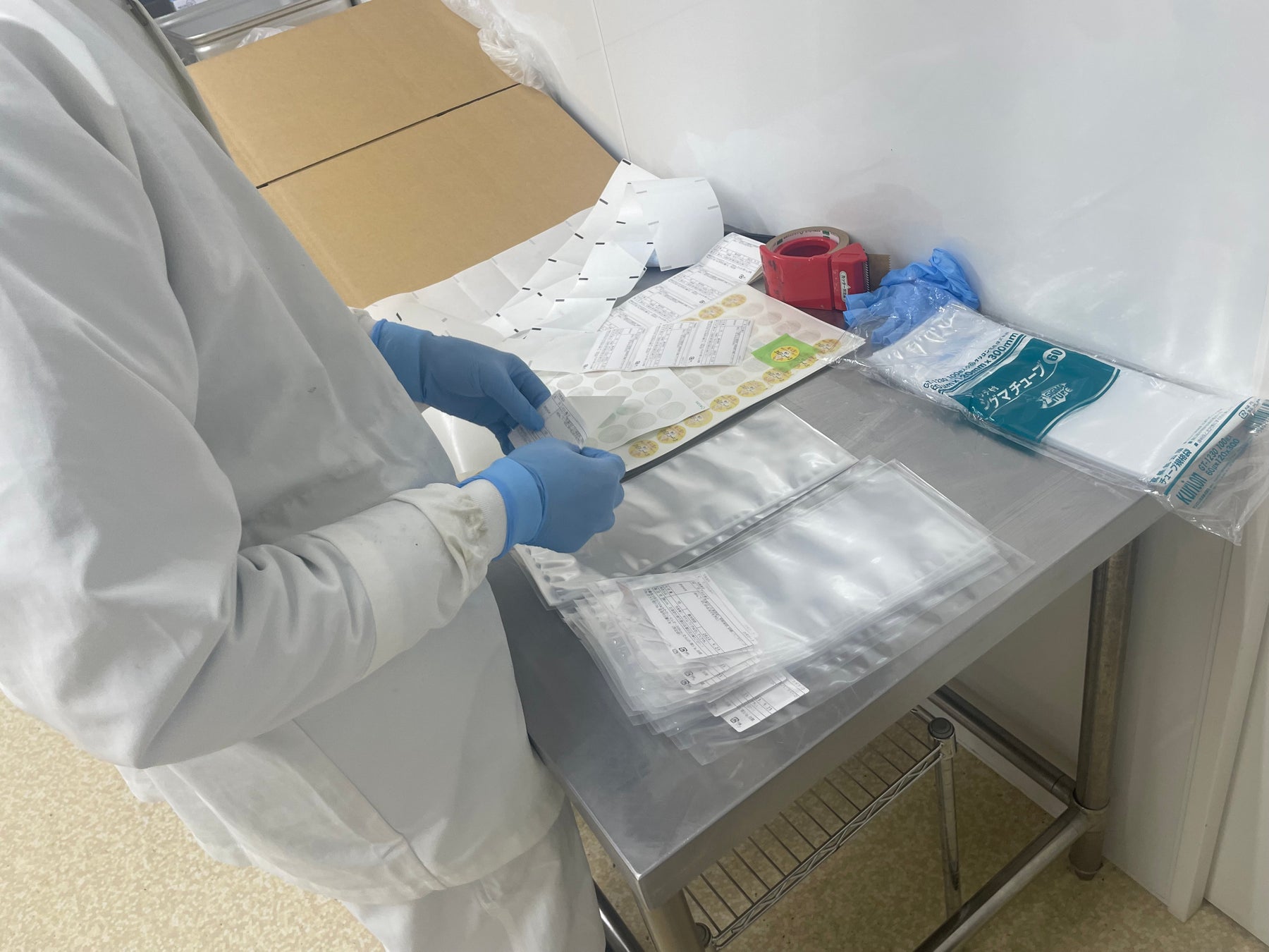 ケーキを入れる箱折り作業や箱や袋に貼るシール貼り作業を
