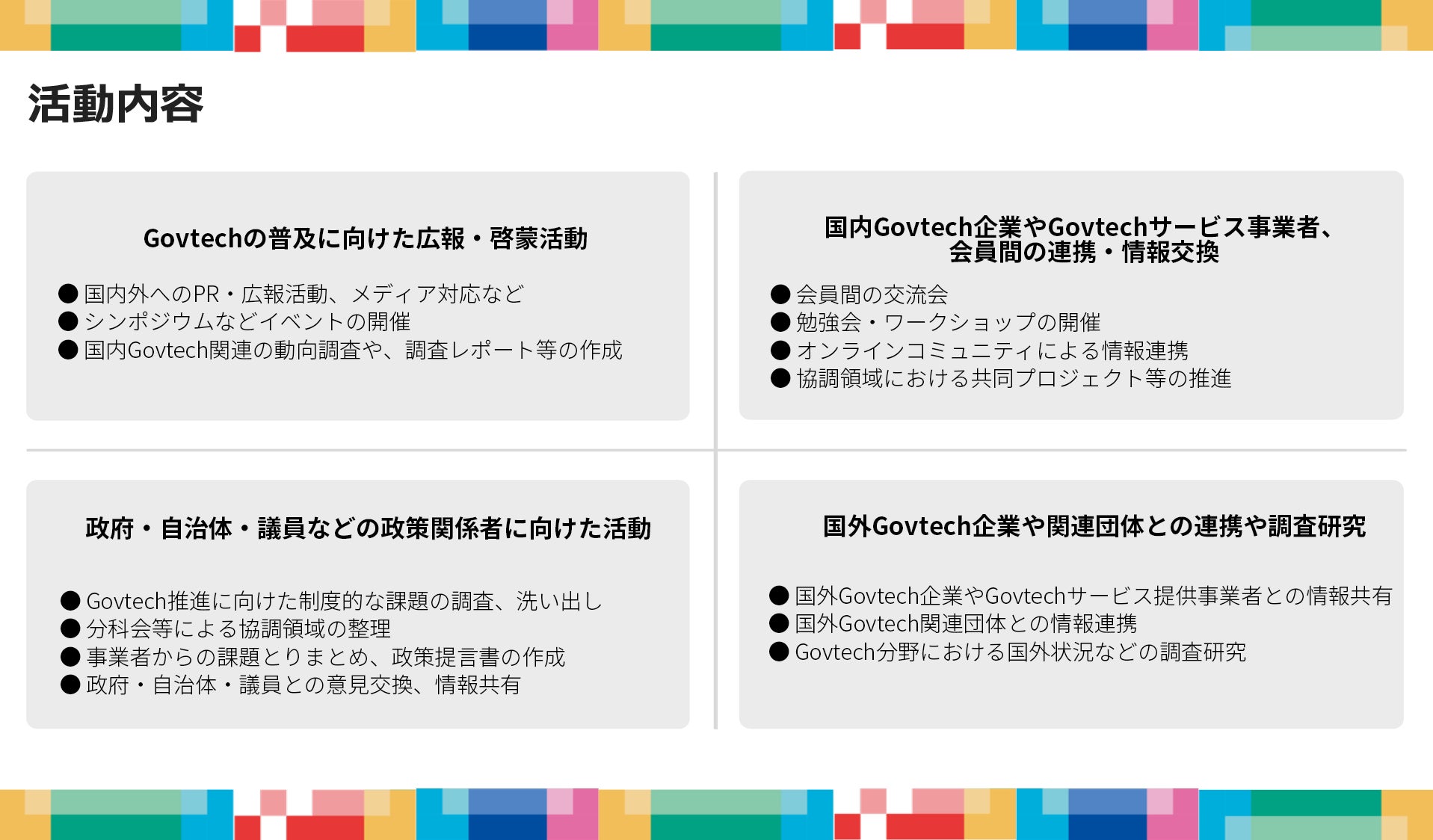 Govtech協会では、Govtechの推進を通して、多様でオープンな官民の関わり合い、公共・行政分野に新しい文化が生まれることで、誰一人取り残されない、人に優しいデジタル社会の実現に貢献できると考え、公共・行政分野のデジタル化を推進する当事者を増やし、民間企業による革新的なGovtechサービスが生まれやすい環境や制度、共創・競争環境の整備を推進します。