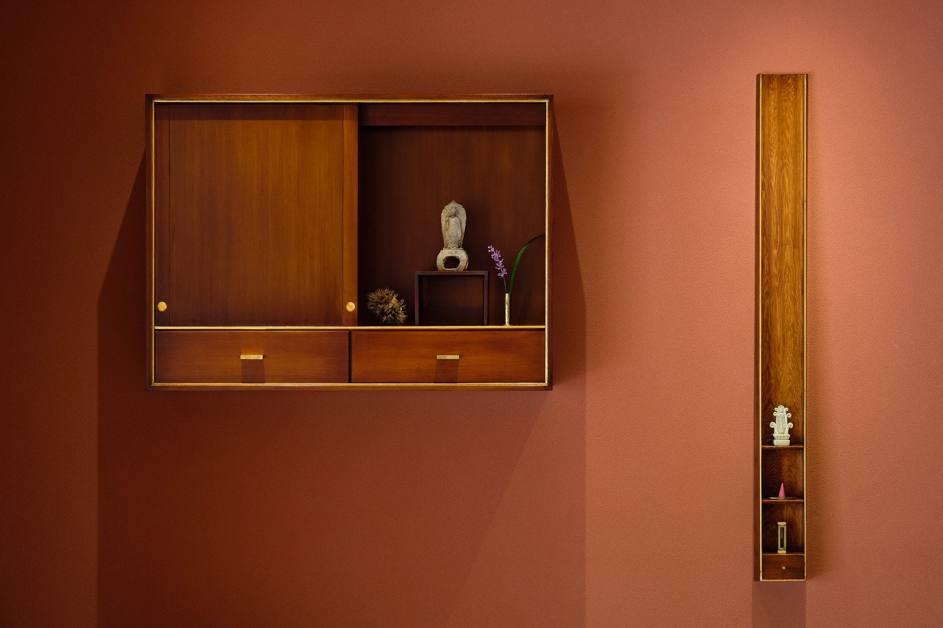 現代の暮らしに馴染むように、壁付けかつ、奥行きを浅くすることで量感を抑えている。飾り床+棚としても使用できる。木目を生かした拭き漆とすることで、木地職人と漆職人の技を際立たせる。引き出しの取手は無垢真鍮の削り出し。