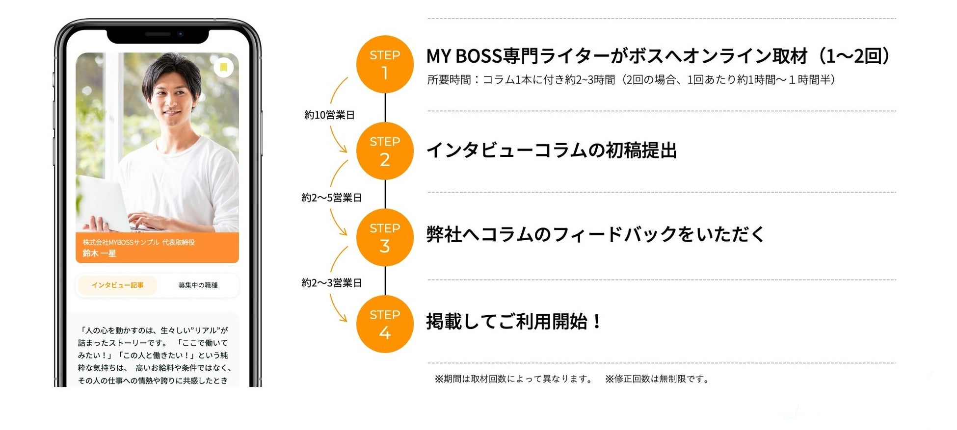 ・社長、もしくは事業責任者がボスとして取材を受けていただき、インタビューコラム掲載し、MY BOSSをご活用いただける企業様
