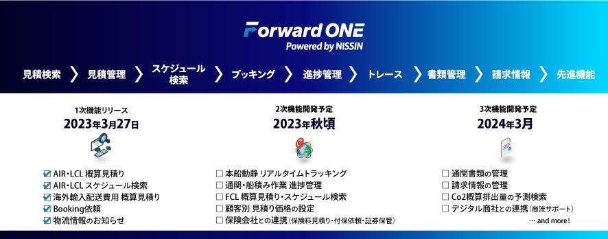 株式会社日新(神奈川県横浜市、代表取締役:筒井雅洋、以下日新)は、デジタルフォワーディングサービス「Forward ONE」を全面リニューアルし、2023年3月27日にサービス提供を開始したことをお知らせいたします。