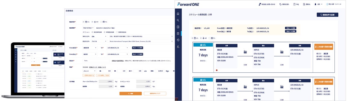 「Forward ONE」では日新が保有する各運賃や国内外の費用、スケジュール情報を連携・活用することで、速やかに概算物流費や日新がご提供する輸送スケジュールをご確認頂くことが可能になります。