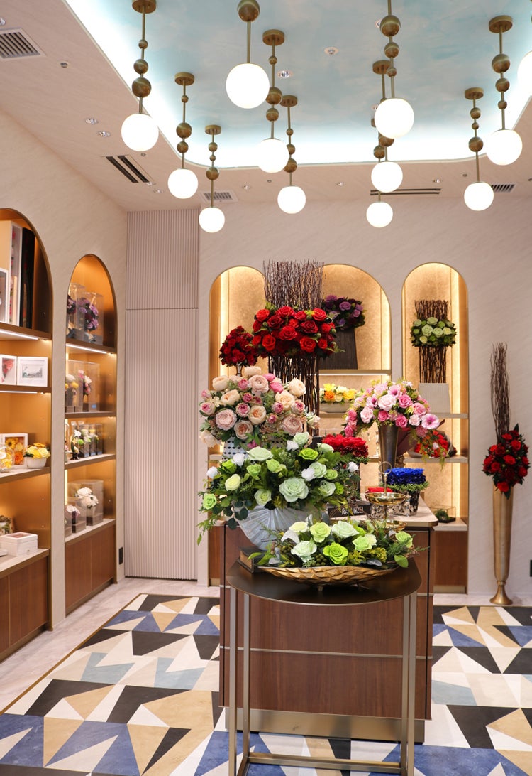 い体験を提供いたします。1階のプリザーブドフラワー専門店ではお祝いや記念日のギフトを販売。シックなインテリアに華やかな数々のプリザーブドフラワーが並び、高さ6m50cm・幅1m60cmの苔のプリザーブドフラワーの壁面装飾や特徴的なライティングが贅沢な空間を演出しています。また、ホーム・オフィス・ショップ等のインテリア装飾をオーダーメイドで提案する新サービス「Maison(メゾン)」をスタートし、2階のVIPルームでご要望をもとにフラワーデザイン装飾の専任チームが、唯一無二の作品をご提案いたします。