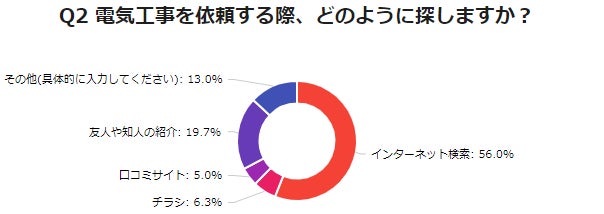 どのように電気工事を探しているかは、56.0%が「インターネット検索」と回答し、オンラインの接点を増やすのとSEOを強化する必要があると感じました。