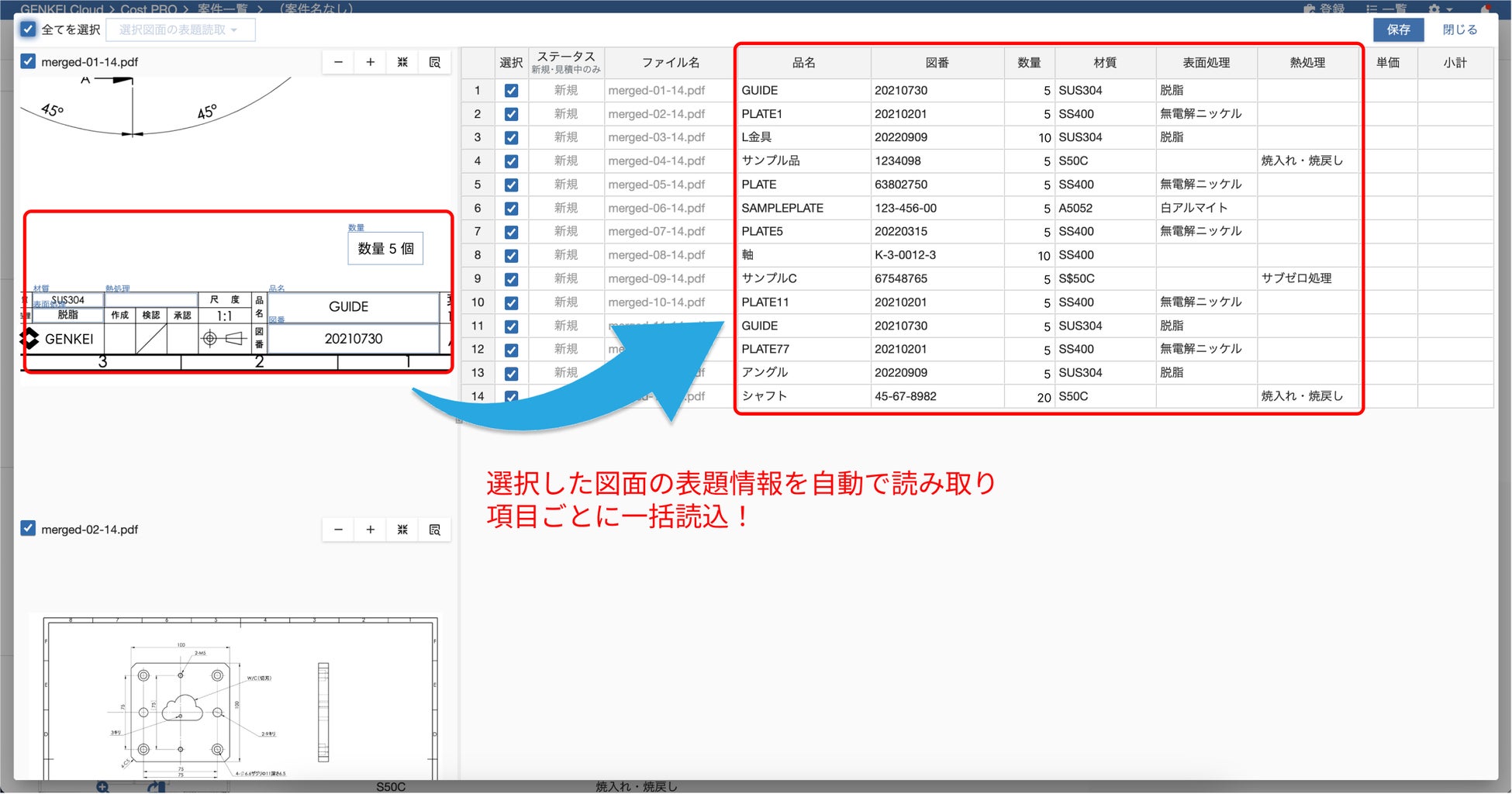 読み込んだ情報は下図のように自動で一覧化され、保存ボタンを押すだけで複数の図面の表題情報が登録されます。