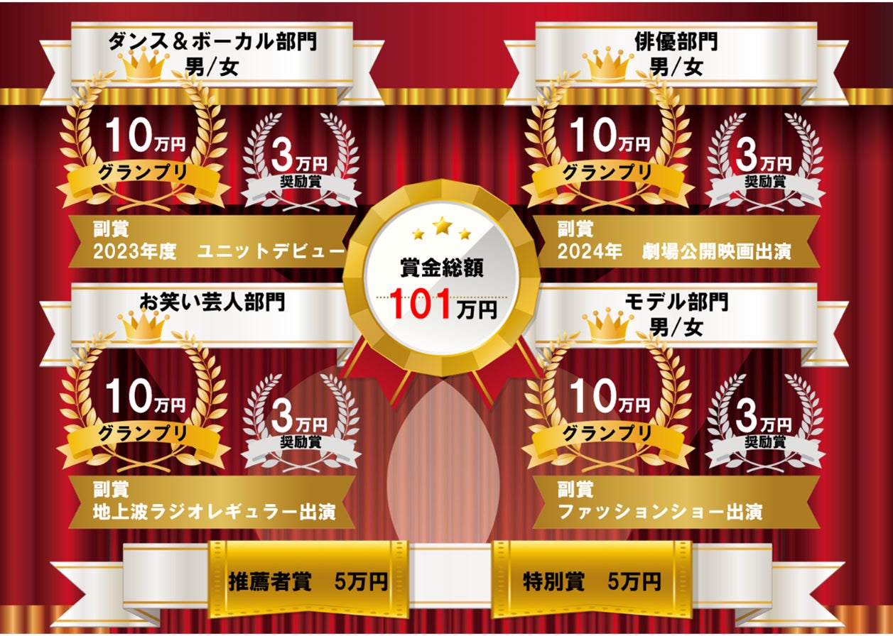 受賞者には各賞のグランプリ10万円などの賞金が贈られるほか、副賞としてユニットデビューや地上波ラジオ番組のレギュラー出演、劇場公開映画への出演などが盛りだくさんとなっているほか、レッスンを無償で受講できるなど、様々な特典を準備しています。