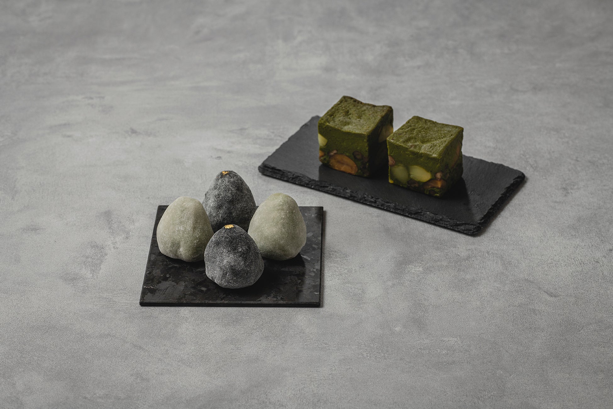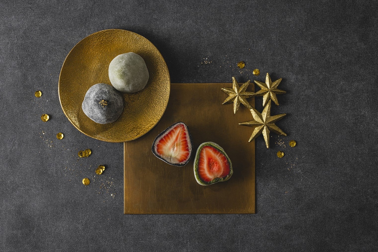 竹炭入りの黒色の求肥で包み、金粉をまぶした「星空」をイメージしたいちご大福と、緑の抹茶餡×赤のいちごの「クリスマスカラー」をイメージした いちご大福をお楽しみください。