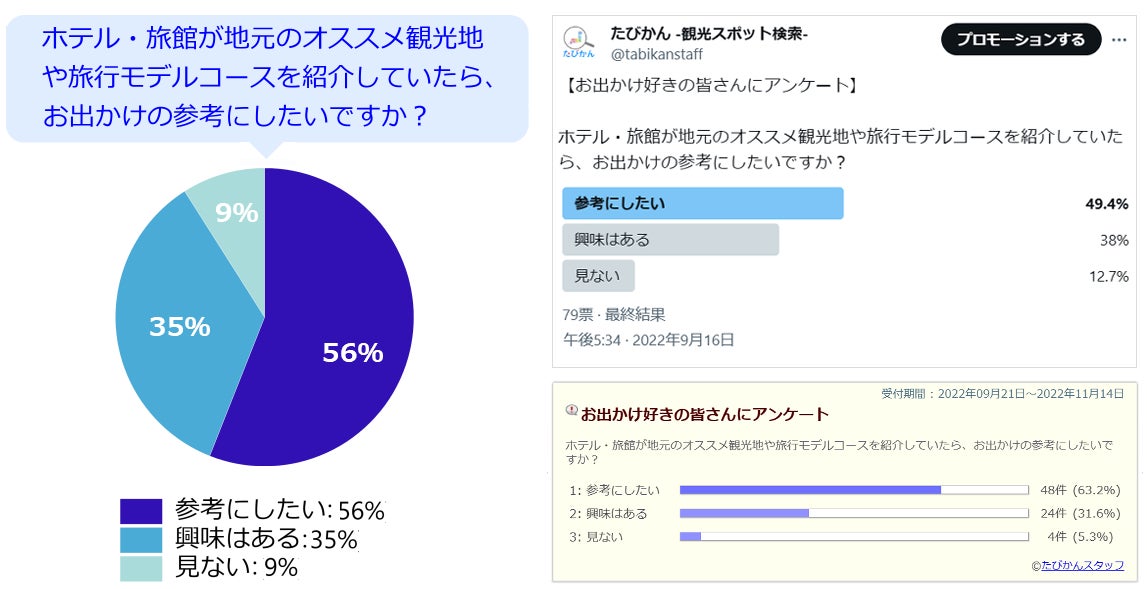 たびかんが2022年9月から11月にかけて、当社ホームページ、及び X(旧Twitter)を利用し、実施したアンケート調査「ホテル・旅館が地元のオススメ観光地や旅行モデルコースを紹介していたら、お出かけの参考にしたいですか?」に対し、回答数 155 票のうち半数以上が「参考にしたい」と回答し、「興味はある」を含めると、90%以上の方が高い関心を示した結果になりました。