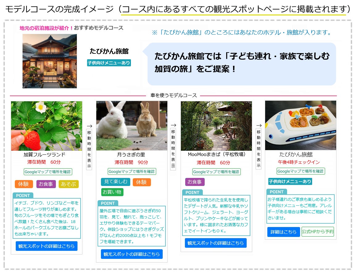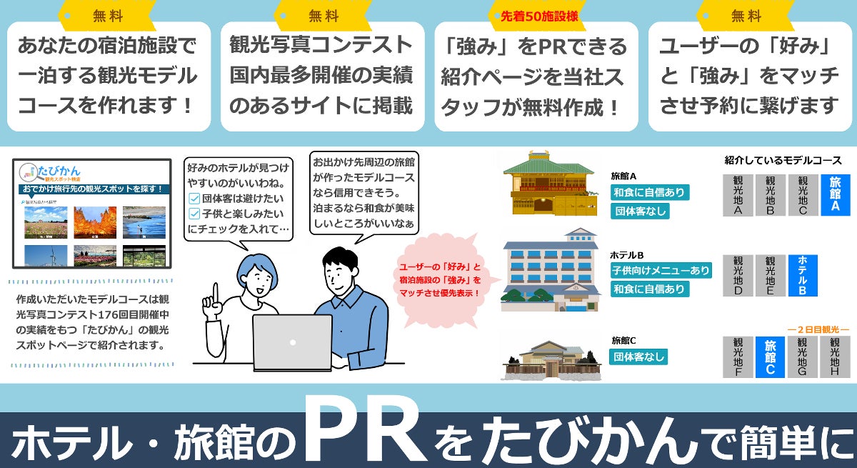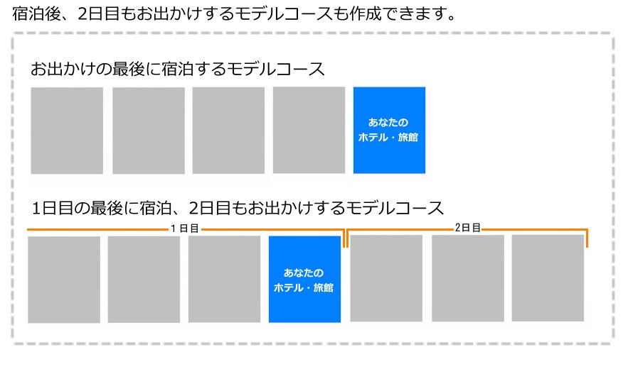 作成できるモデルコースは1泊2日を想定しており、1泊の宿泊先は作成された宿泊事業主様のホテル・旅館となります。作成されたモデルコースは、観光スポット検索サイト「たびかん」の観光スポットページで紹介されることで、宿泊事業者様のPRが期待されます。