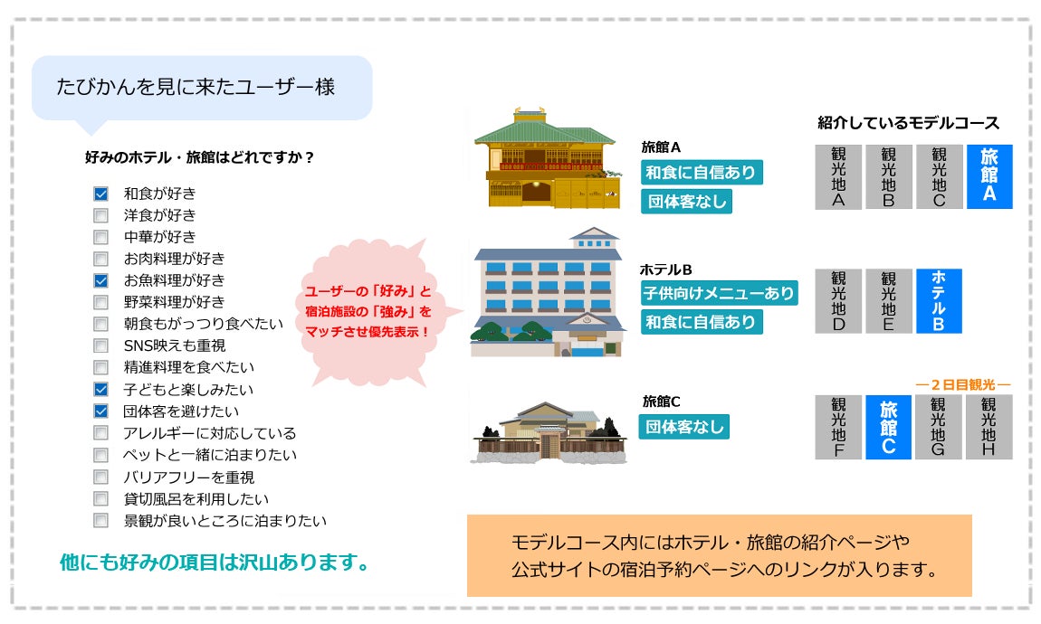 株式会社たびかん(所在地:東京都町田市、代表取締役社長:鈴木隆史、以下「たびかん」)は、ホテル・旅館などの宿泊施設側の持つ「強み」と宿泊者側の「好み」をマッチングする新システムを2024年3月15日(金)リリースいたします。