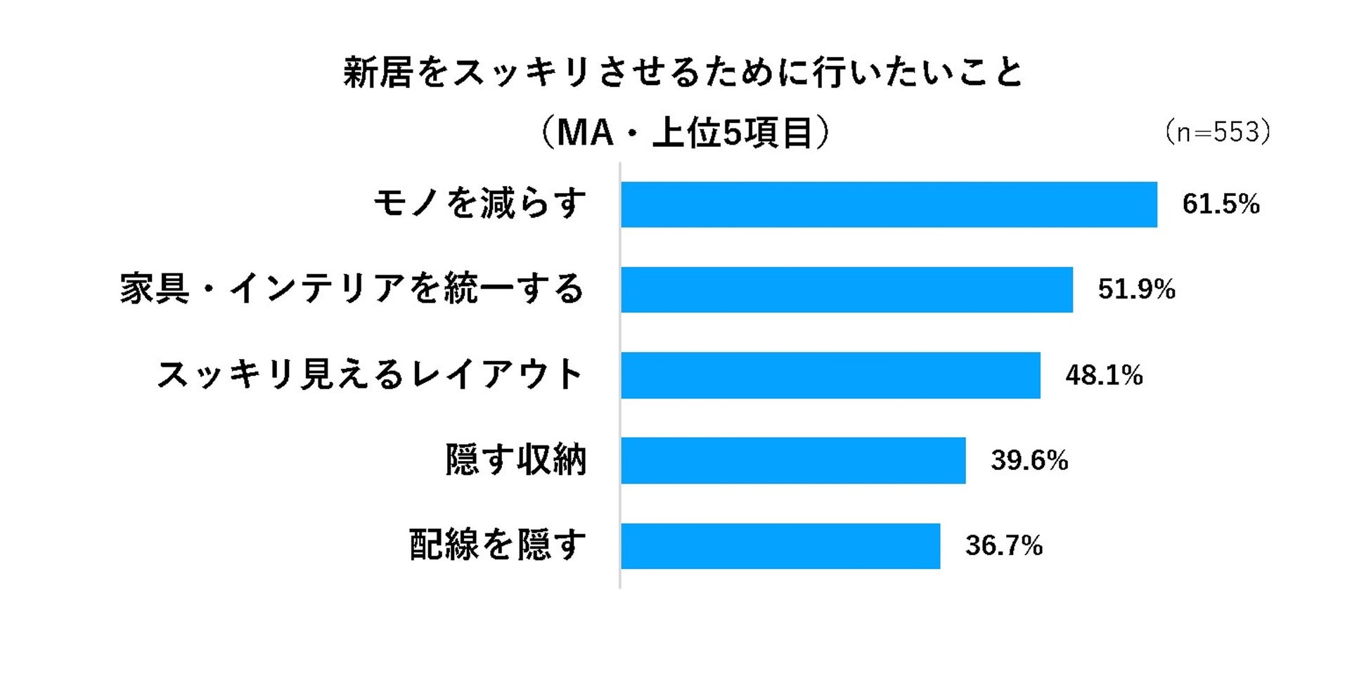 回答者全員に「新居をスッキリさせるために行いたいこと」を尋ねたところ、最も高い回答率は「モノを減らす」(61.5%)でした。さらに、家具やインテリアの見た目やレイアウトの工夫、隠す収納や配線を隠すなどが上位に挙がりました。
