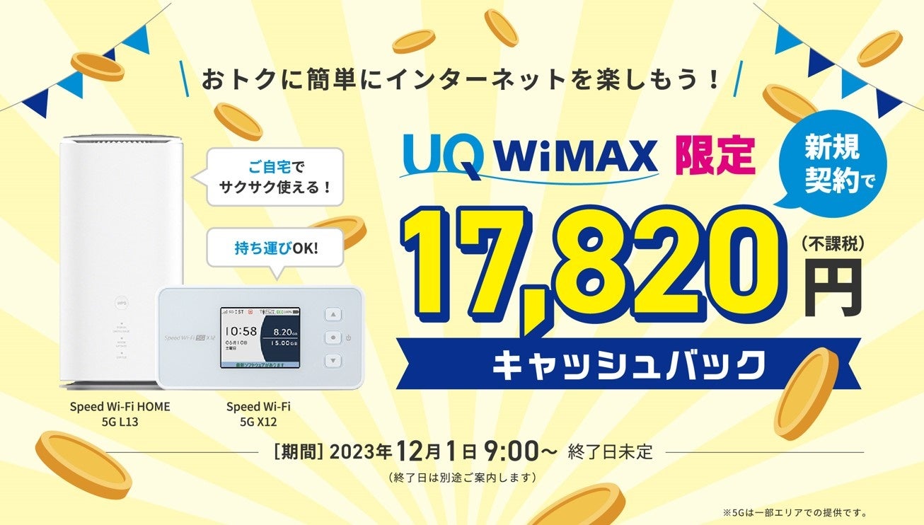 UQ WiMAX オンラインショップでは、UQ WiMAXのホームルーター「Speed Wi-Fi HOME 5G L13」またはモバイルルーター「Speed Wi-Fi 5G X12」の購入と同時に、「ギガ放題プラスS」または「ギガ放題プラスS Netflixパック」に新規加入いただいたお客さまを対象に、17,820円のキャッシュバックを実施中です。(https://shop.uqwimax.jp/shop/cashback/)