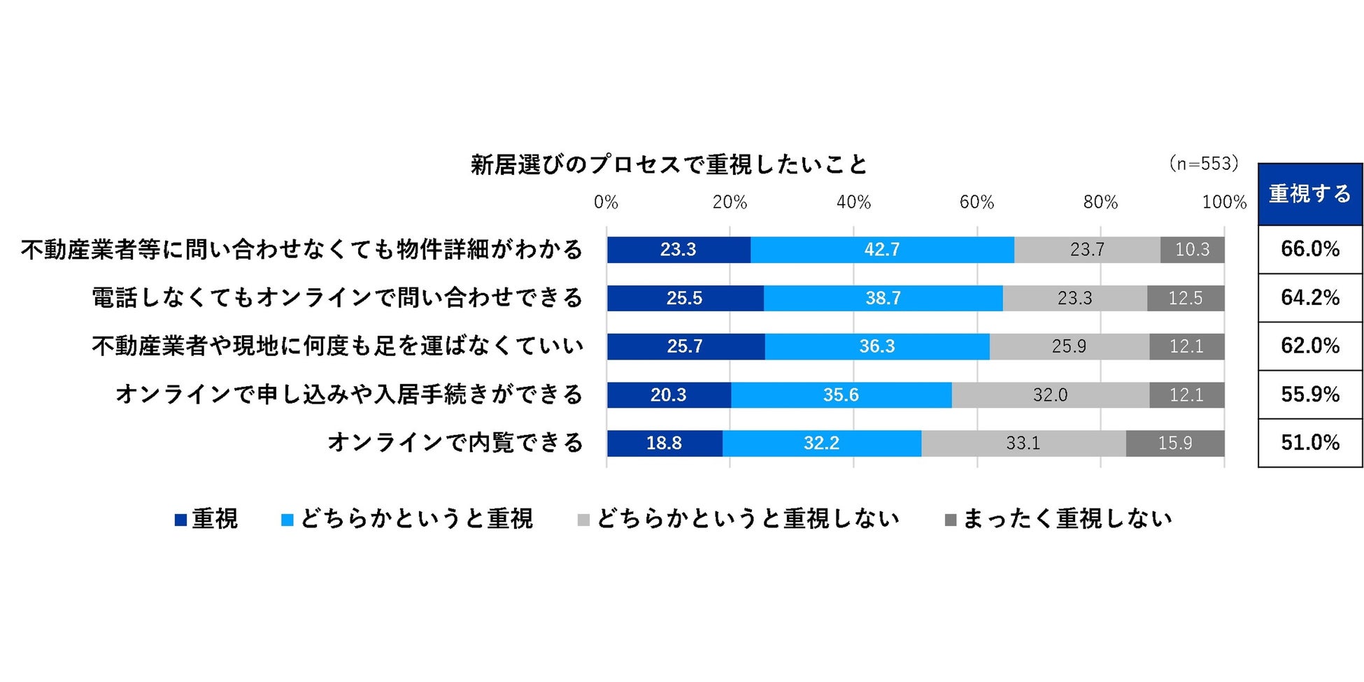 調査対象者に新居選びのプロセスで重視する点を尋ねたところ、オンライン主体で新居選びができることを重視する人が半数以上を占めることが明らかになりました。問い合わせだけでなく、申し込みや入居手続きまでオンラインでできることを重視する人も、55.9%に及んでいます。