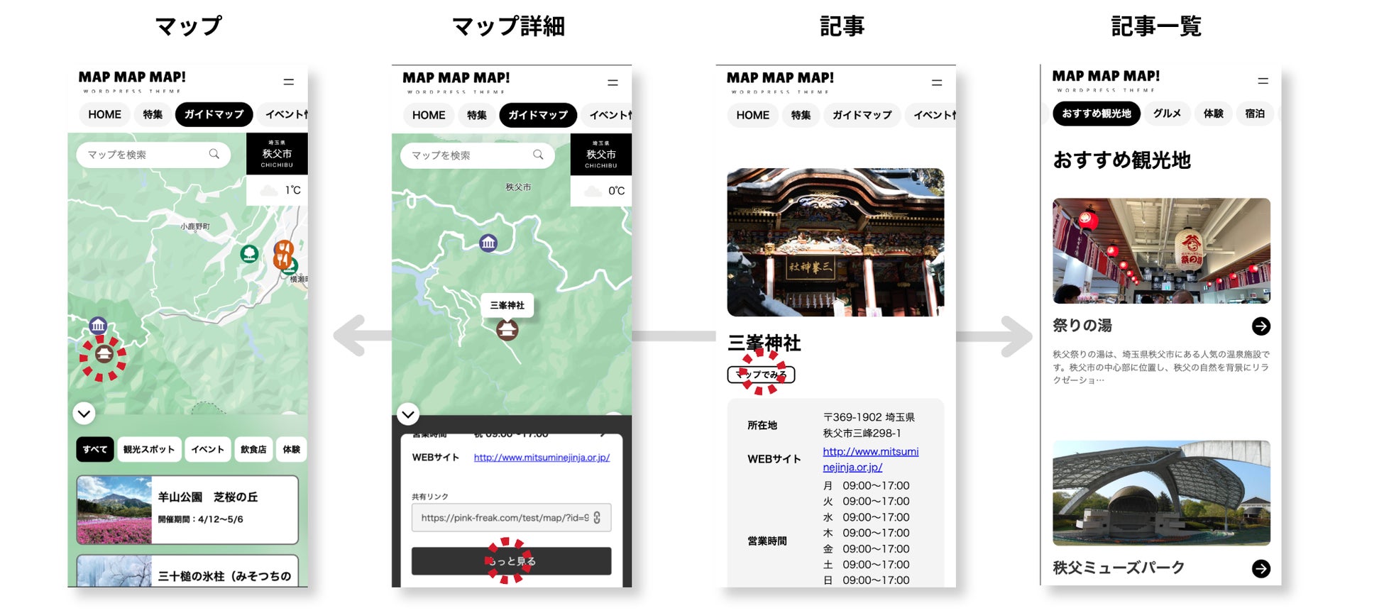 WordPressベースのブログシステムとデジタルマップを組み合わせることで、記事とマップが連動し、訪問者に対して直感的な情報提供を可能に