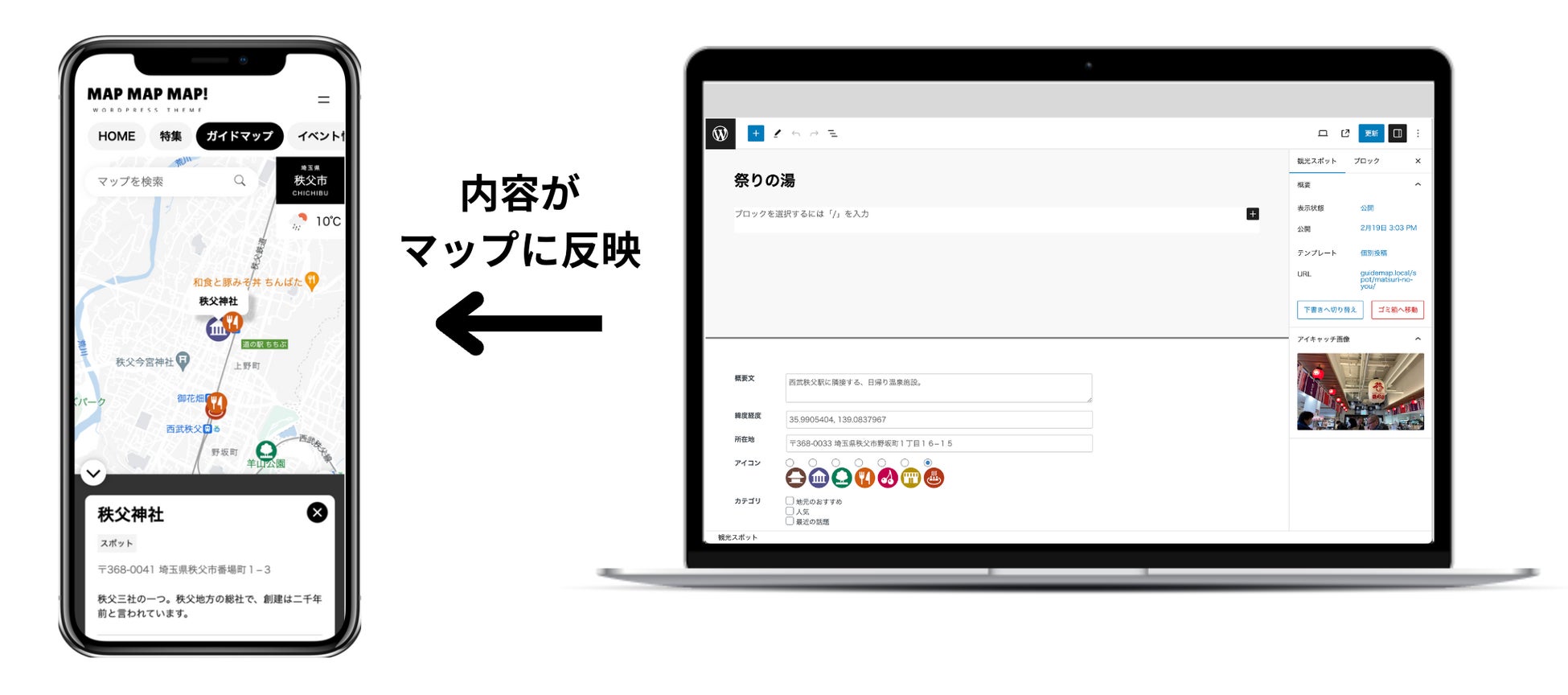 WordPressベースのブログシステムとデジタルマップを組み合わせることで、記事とマップが連動し、訪問者に対して直感的な情報提供を可能にします。投稿されたスポットは地図上にプロットされ、表示範囲に応じて推薦されるスポット情報が自動的に更新されます。