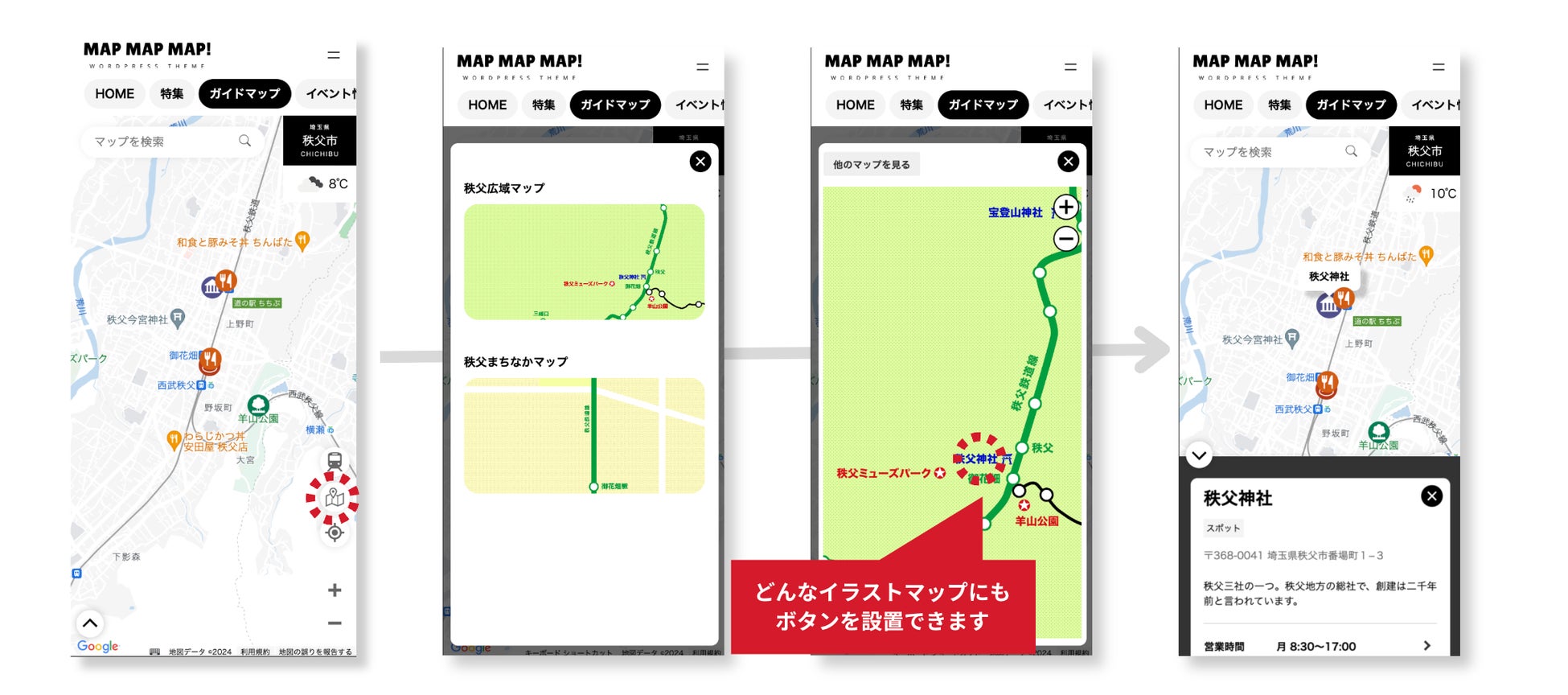従来紙地図で使用していたさまざまなイラストのマップを、デジタルマップと連動させて表示させることが可能です。訪問者が閲覧しているエリアに対応して自動的に表示されるため、地域の特色をより鮮やかに伝えることが可能です。