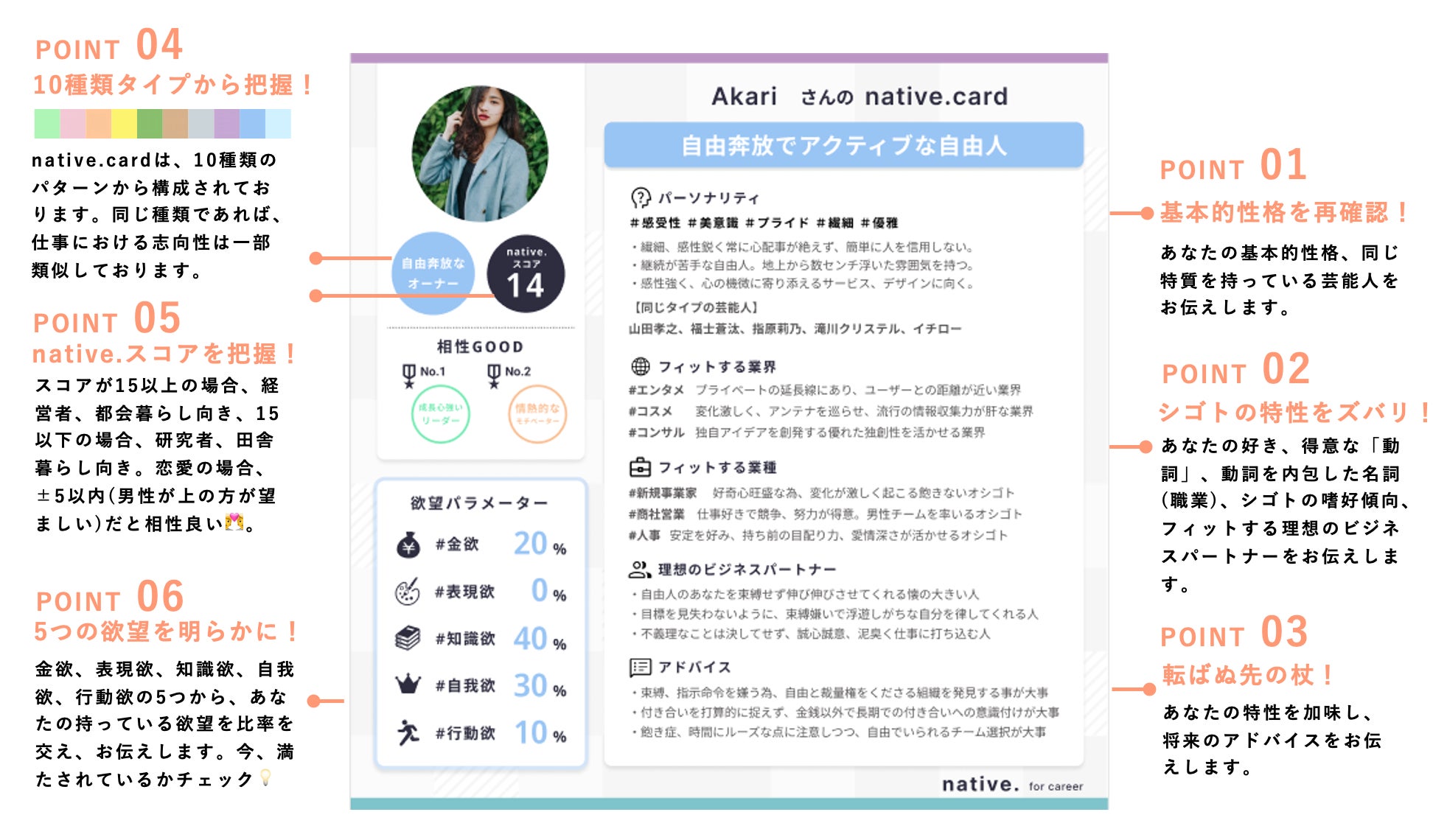 native.は、生年月日を入力するだけで、統計学をベースにしたパーソナルカード「native. card」が発行されます。「native. card」を通じて自然体の自分にフィットするシゴト、恋人、暮らし、旅、子育ての人生選択を支援する唯一無二のwell-beingサービスです。