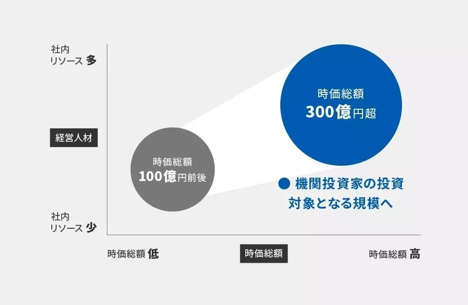支援を通じて時価総額300億~600億へ引き上げた後は、契約を積極的に解除し、更に上位レイヤーで支援をしているコンサルティンググループへ引き渡すことを推進します。