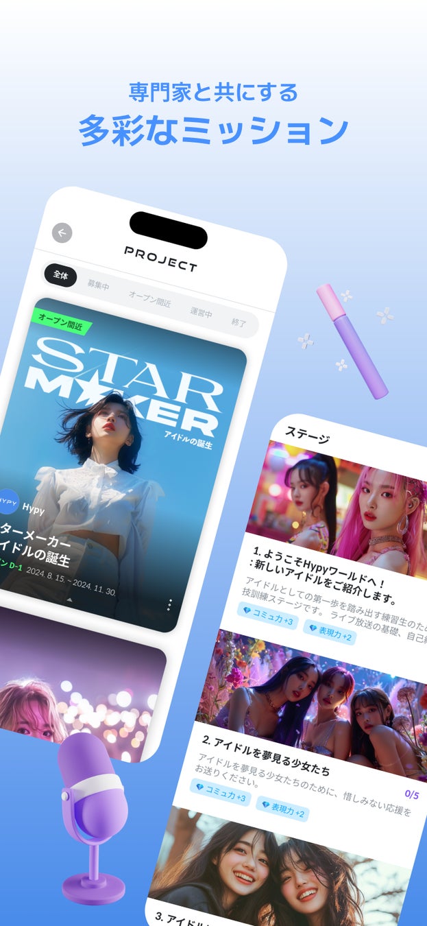 本アプリは、アイドルを目指す方と、アイドルを応援したい方が繋がるコミュニティーを提供します。アイドル候補生の方は、アプリ内でエンターテインメント業界のエキスパートが準備した歌、ダンス、ライブ配信などの各種「ミッション」を行うことにより、アイドルになるための基礎知識をいつでもどこでも学べる他、それをコンテンツとして発信することができます。