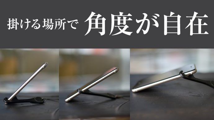 この『タテオキ。』1本で、縦でも横でもスマホを立てられて、かける場所で角度も自在に調整できます。