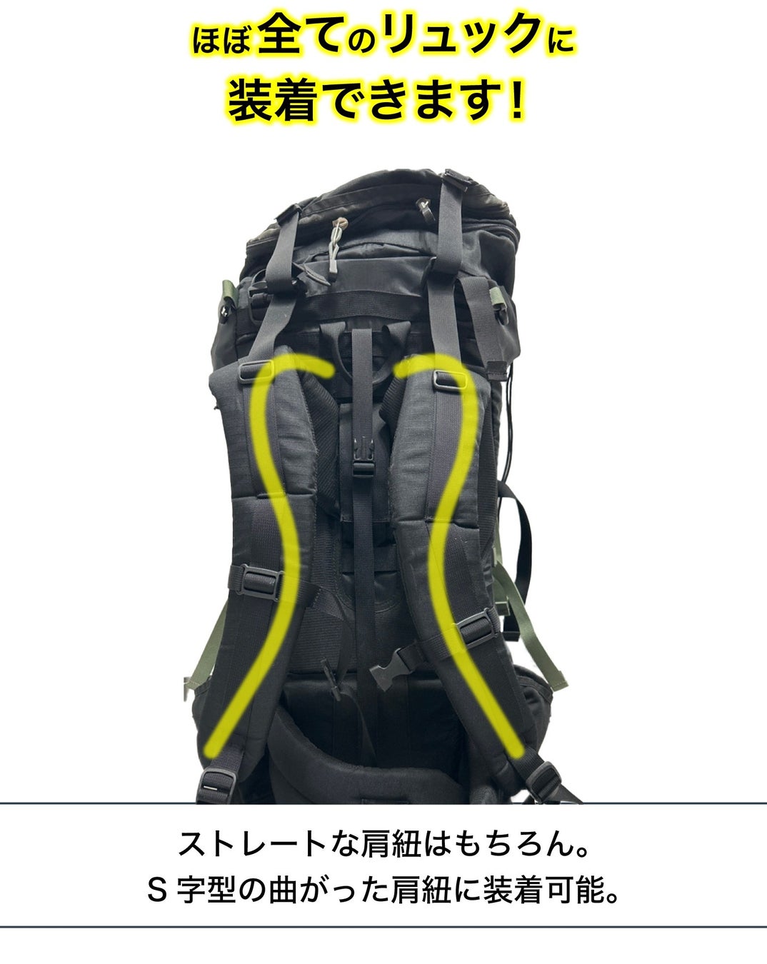 S字に曲がった肩紐のリュックにも取り付けることができるので、ほとんどのリュックにも取り付けることができます。