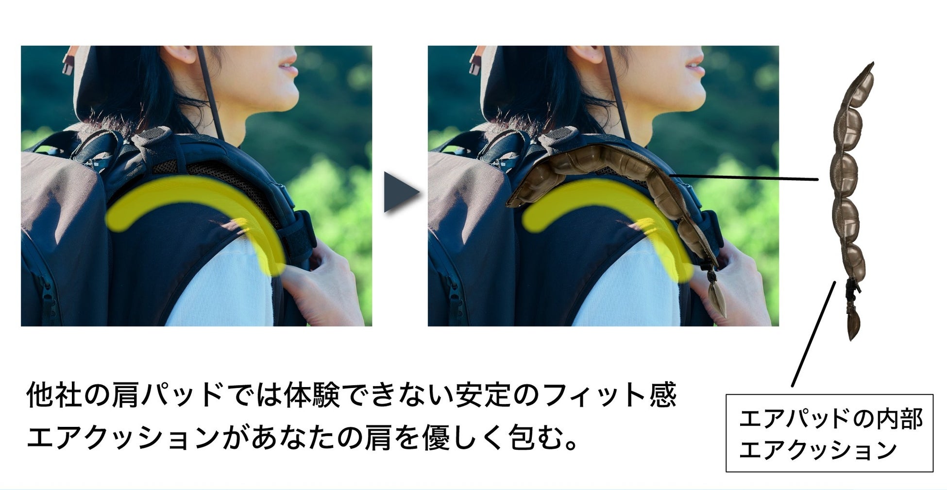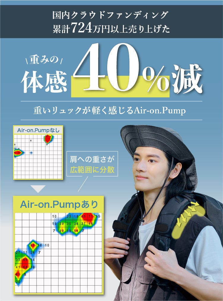 利用者の約90%が重さの軽減を実感!リュックの重さを体感40%軽減する肩パッド【Air-on.Pump】、12月26日(木)よりMakuakeにて先行販売開始!