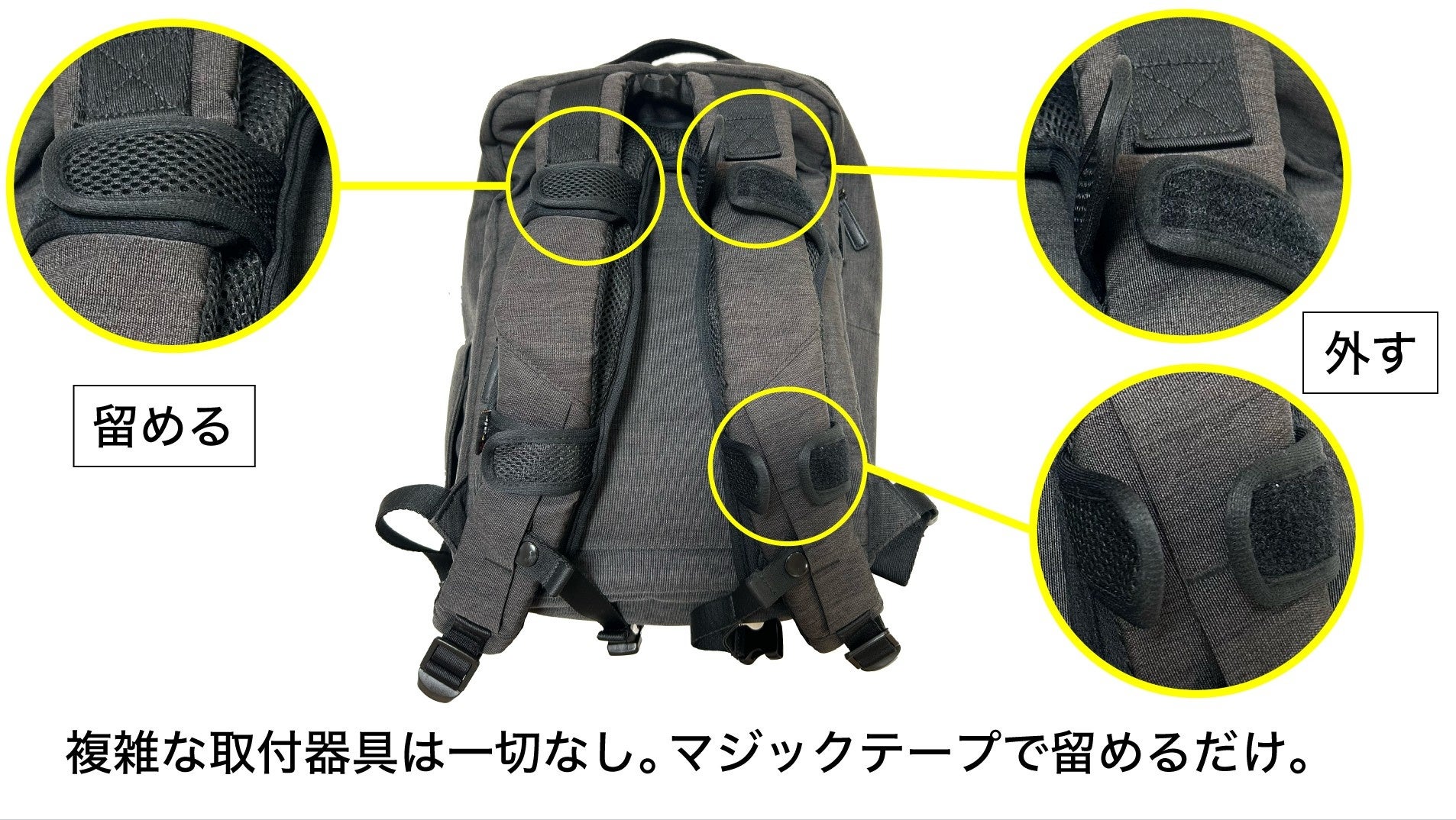 取り付け方はとっても簡単!リュックの肩紐の部分に巻き付け、面ファスナーで閉じるだけ。