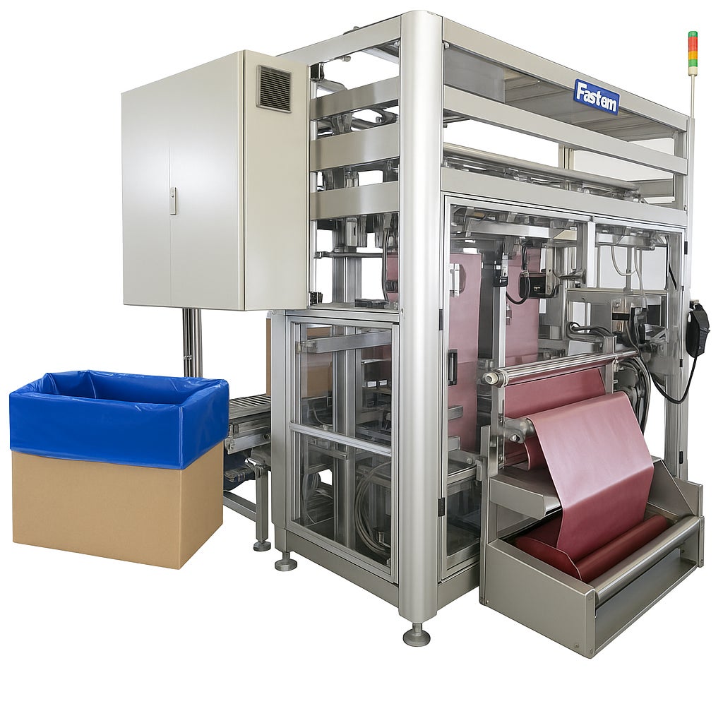 全自動ポリ袋装着機(ポリオートセッター)は、空のケースに内袋としてポリ袋を自動で取り付けるための機械です。段ボールや発泡スチロール、コンテナなどの空ケースを設置するだけで、ポリチューブを自動で袋状に溶着カットして、ケース内四隅にきれいに装着し、ポリ袋の端をケースの開口部外部へ折り返す…といった一連の作業を全て全自動で連続して行います。