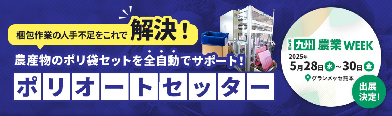 農産物の包装・梱包作業現場で活躍する全自動ポリ袋装着機(ポリオートセッター)が西日本最大級の農業・畜産の展示会「第3回九州農業WEEK」に初出展