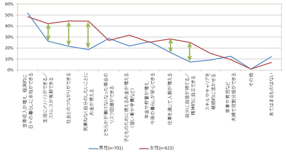 共働きで良かったと感じることや満足していることは、経済的に日々の暮らしに余裕ができることが最上位でした。男女別では、「生活にメリハリができる/ストレスが発散できる」、「社会とのつながりができる」などに開きがみられ、特に女性が社会参加やライフスタイルの充実に関して、共働きで良かったと感じていることがわかりました。
