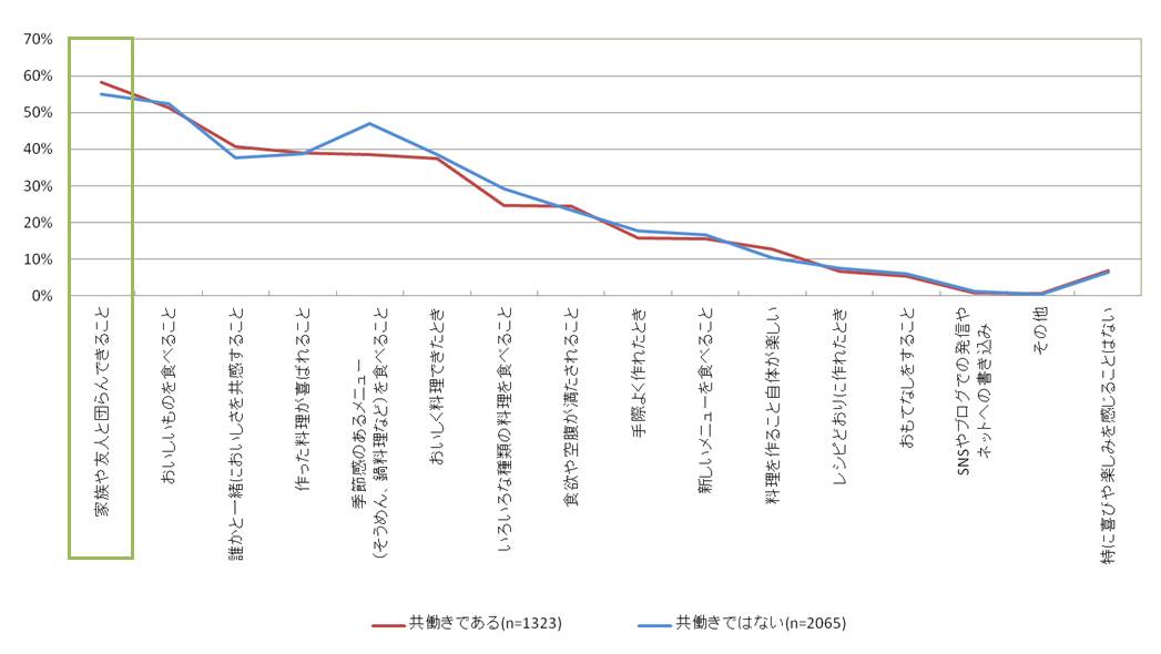 自宅での食事に関することで一番喜びを感じるのは、「家族や友人と団らんすること」。おいしいものを食べることはもちろん、大切な人と同じ空間で食を楽しむことが重要視されていることがわかりました。