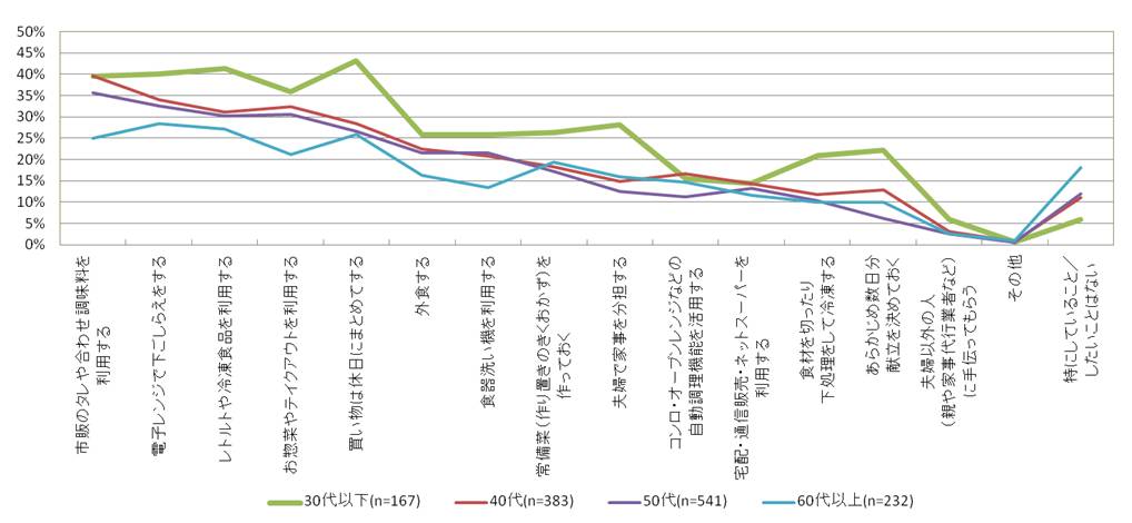共働き家庭の年代別では、年代が低いほど家事の負担を減らすための工夫に取り組んでいることが判明しました。