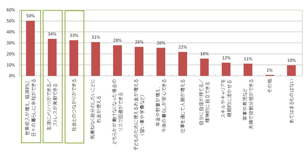 ・共働きで良かったことは、「経済的な余裕」に次いで「生活のメリハリ」や「社会とのつながり」