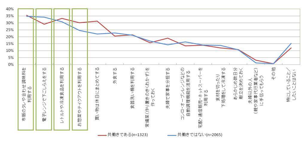 食事に関する家事負担を減らすため、市販のタレや合わせ調味料を利用したり、電子レンジで下ごしらえしたりと、自宅で食事をとる工夫をしていることがわかりました。時間の確保に悩みを抱える共働き夫婦でも、自宅で料理をする「内食」や惣菜等を購入して自宅で食べる「中食」が好まれる傾向にありました。
