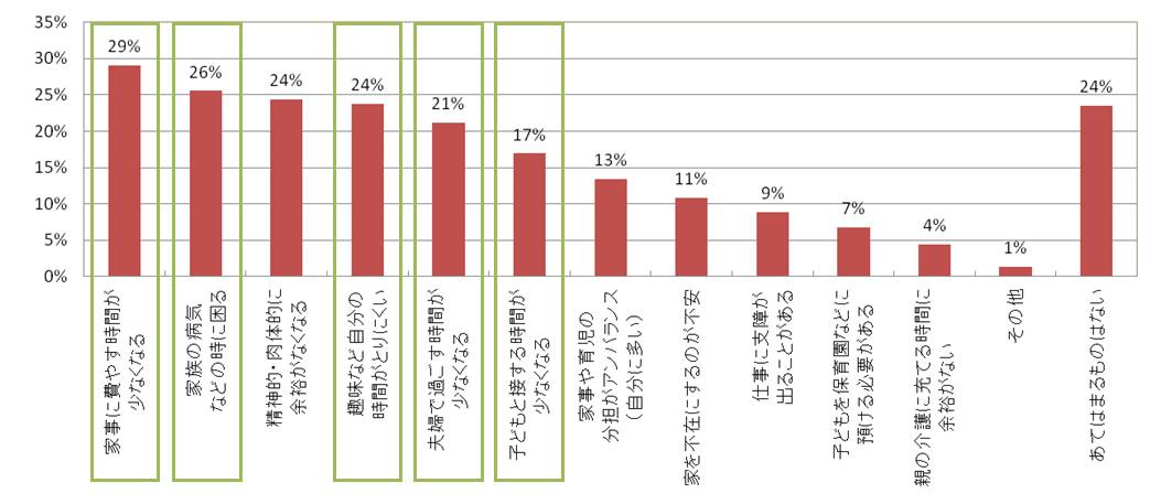 一方、共働きによって大変または不満だと感じることについては、「家事に費やす時間が少なくなる」をはじめとして、家族の病気のときや趣味など自分の時間、夫婦や子どもと過ごす時間がとりにくいと感じていることが判明しました。