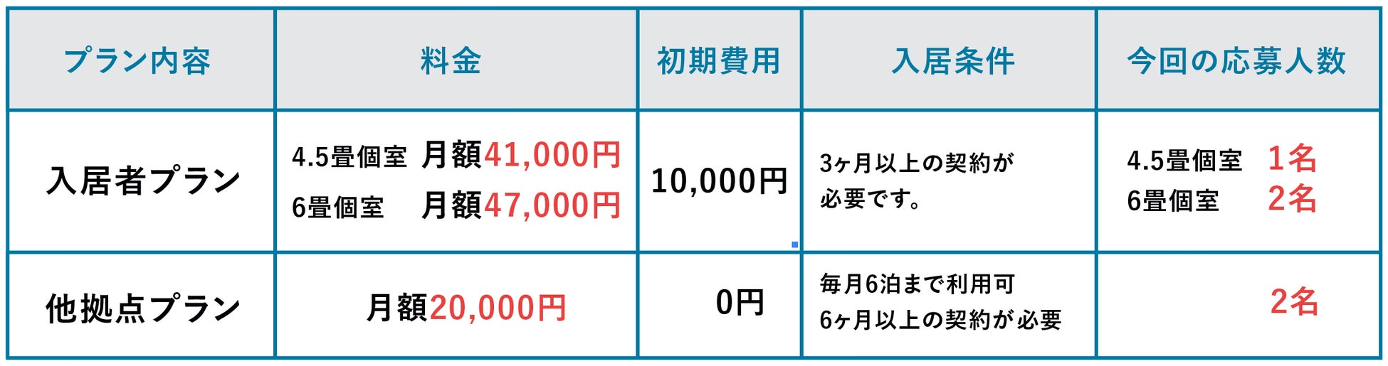 ・多拠点プラン:多拠点生活の一つの拠点として、当施設を利用するメンバー向けのプラン