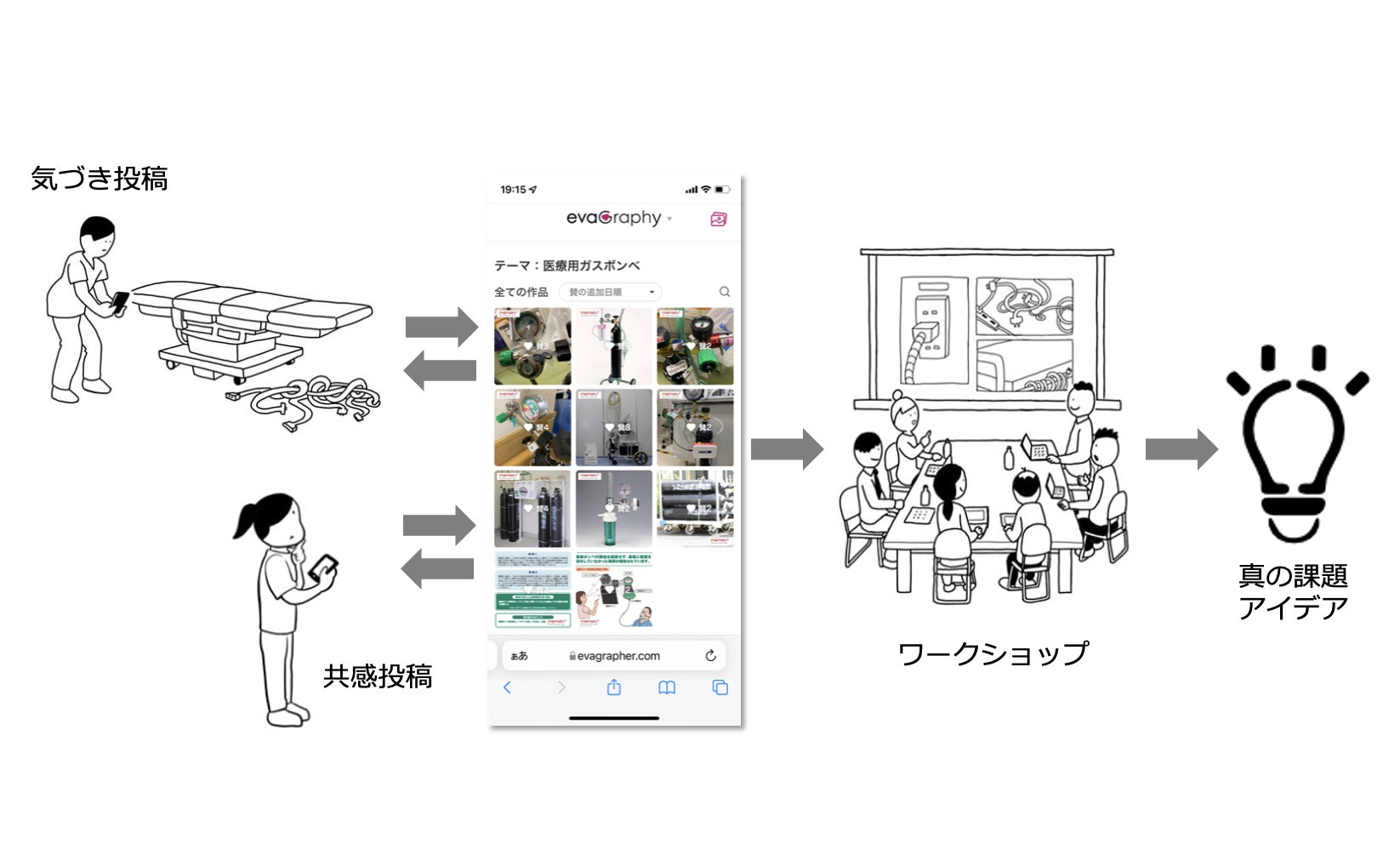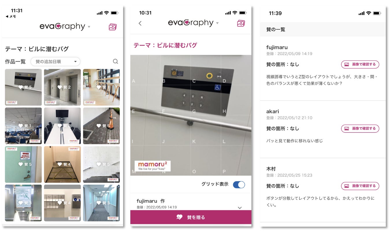 「evaGraphy」とは、医療従事者を中心に専門や組織の枠を超えた多様な職種の参加者が、現場の課題について対話しながら解決するために連携するまもるをまもるが独自開発したオンラインプラットフォームとして誕生しました。昨今、私たちの身の回りには様々な環境や場面で、たくさんのバグが潜んでいます。まもるをまもるの言うバクとは、日常的な不便さから社会全体で解決すべき深刻な問題まで、幅広く存在する物理的・心的など含む障壁を指しています。そういったバグは、小さいものだと気が付きにくく見落とされ、大きなものだと問題提起をしにくいもどかしさがあります。このような “言葉だけでは伝わりにくい”違和感や課題を写真に撮り可視化・共有できることが特徴です。