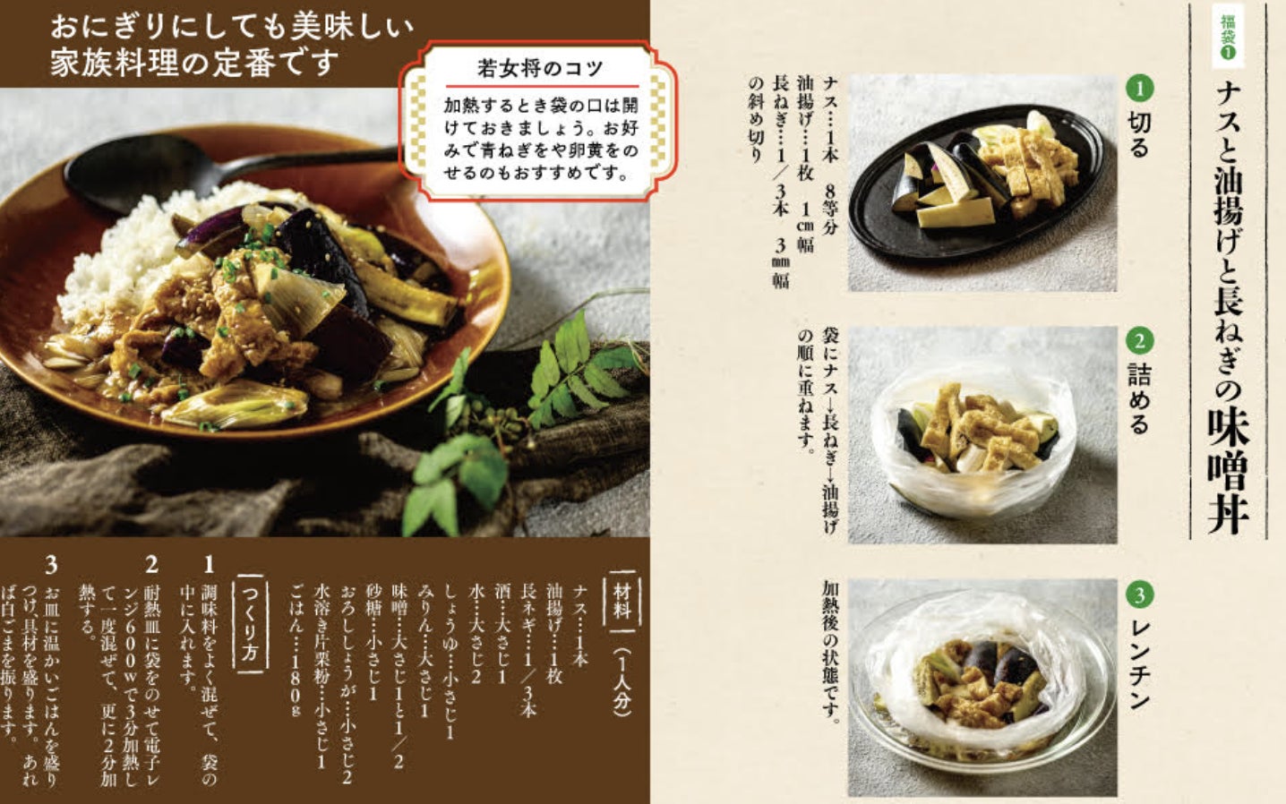 3つの食材を切る、2.市販の耐熱袋に詰める、3.レンチンするだけで